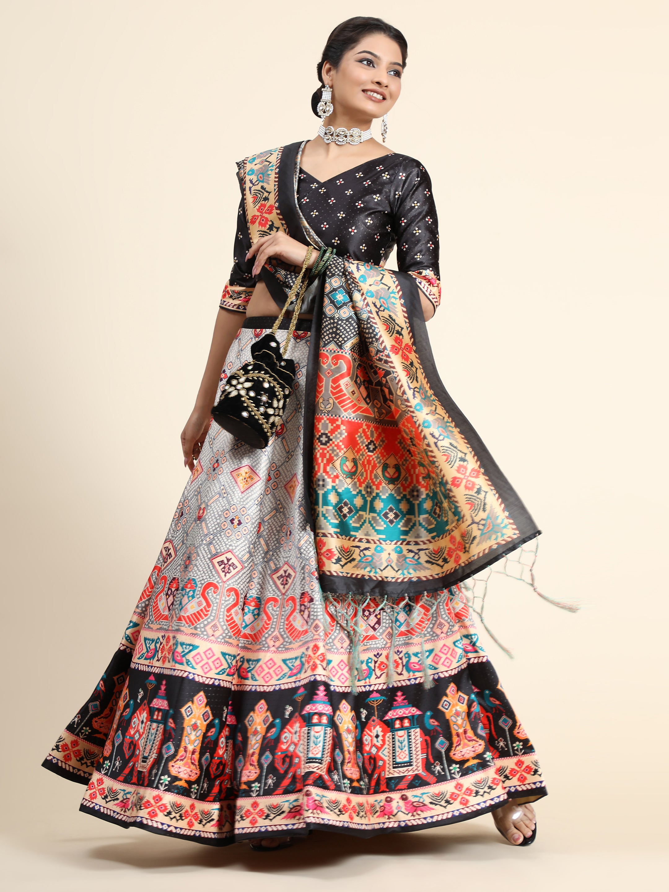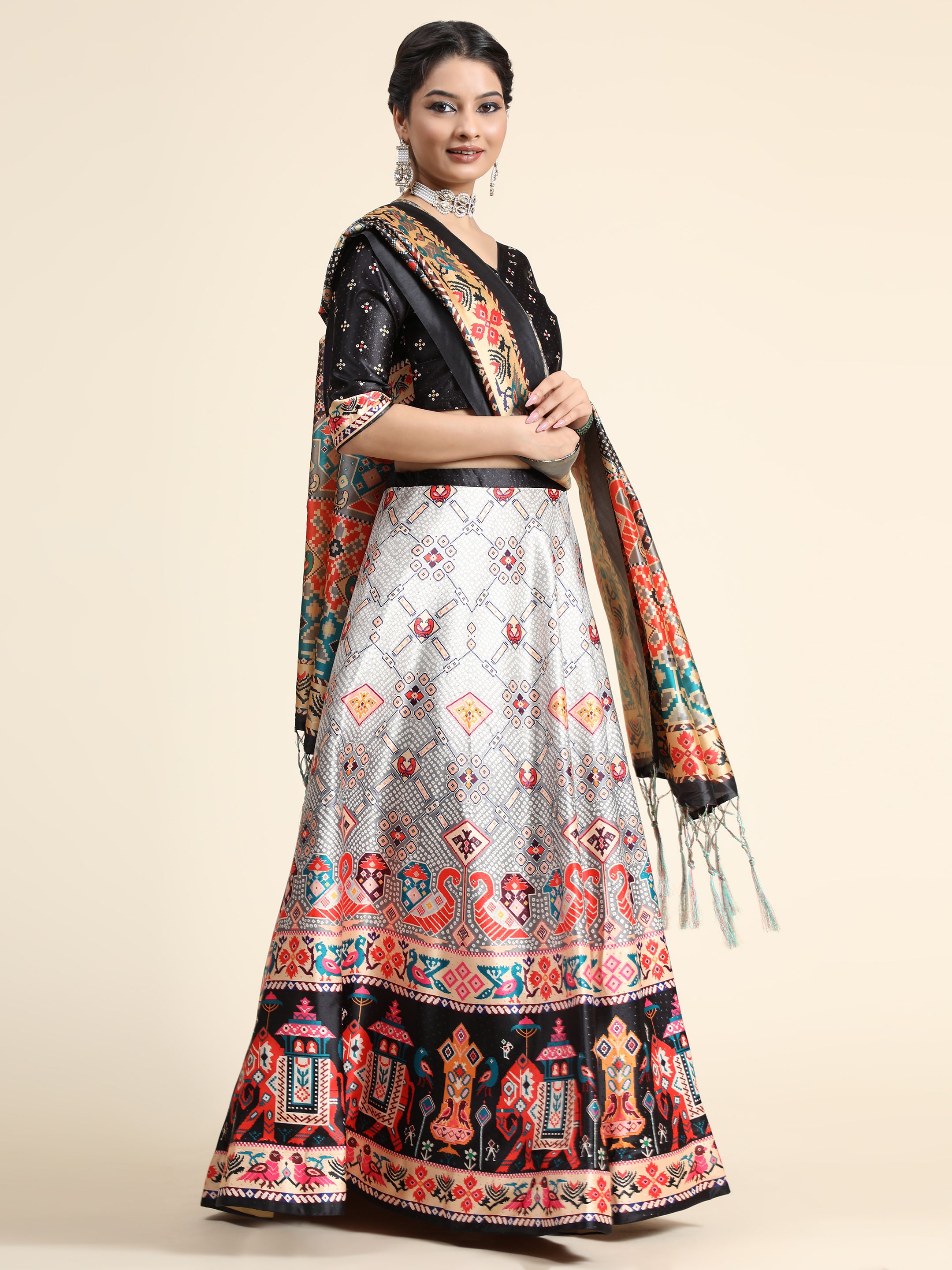 Black and grey printed lehenga choli with dupatta, has bandhani technique and