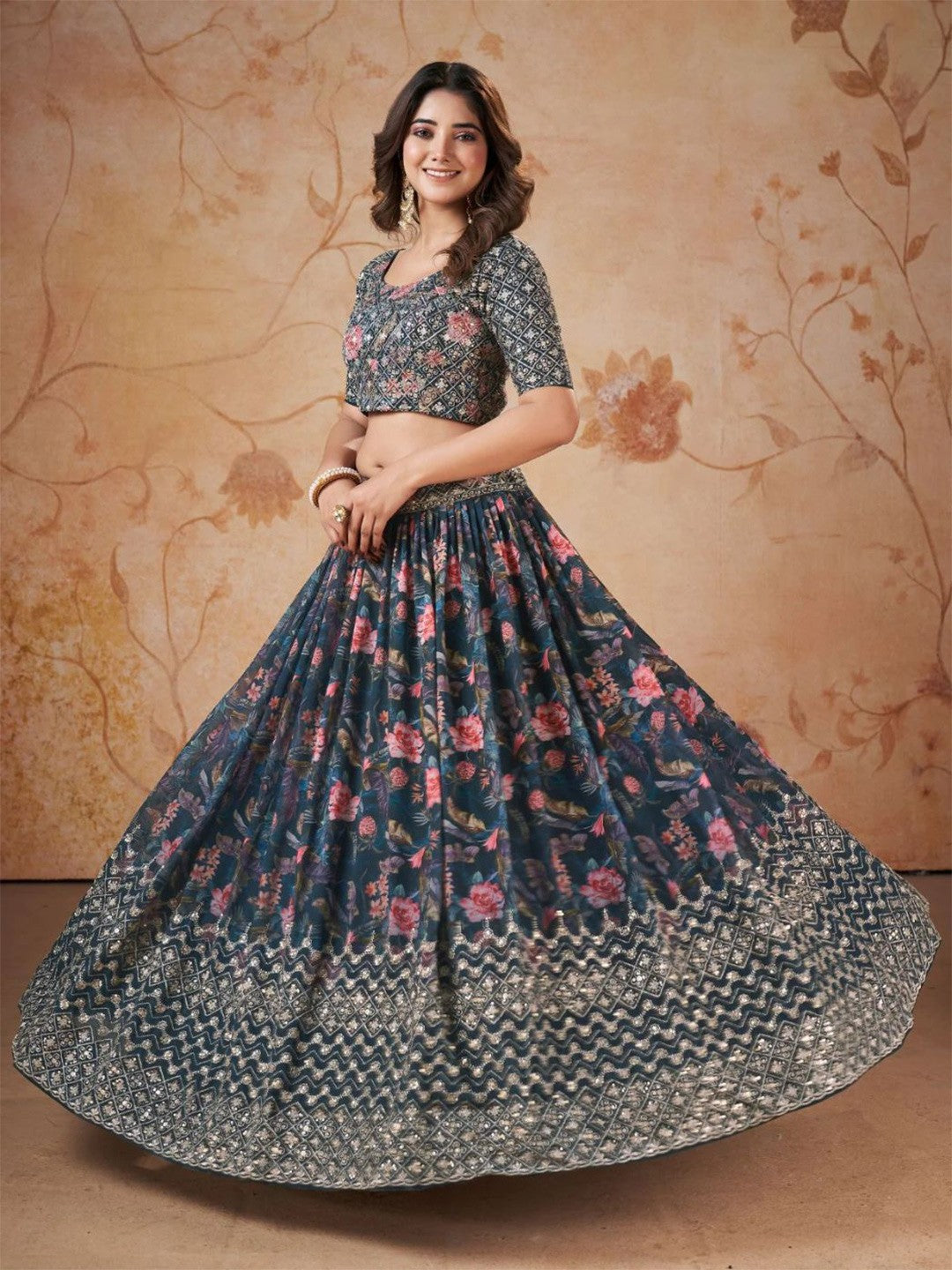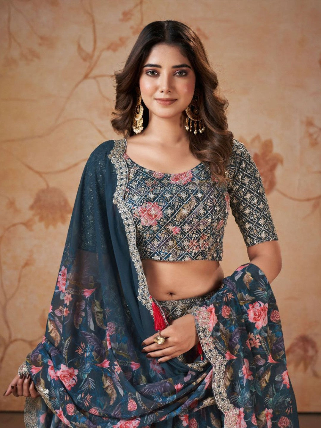 Blue and green embellished lehenga choli with dupatta, sequinned