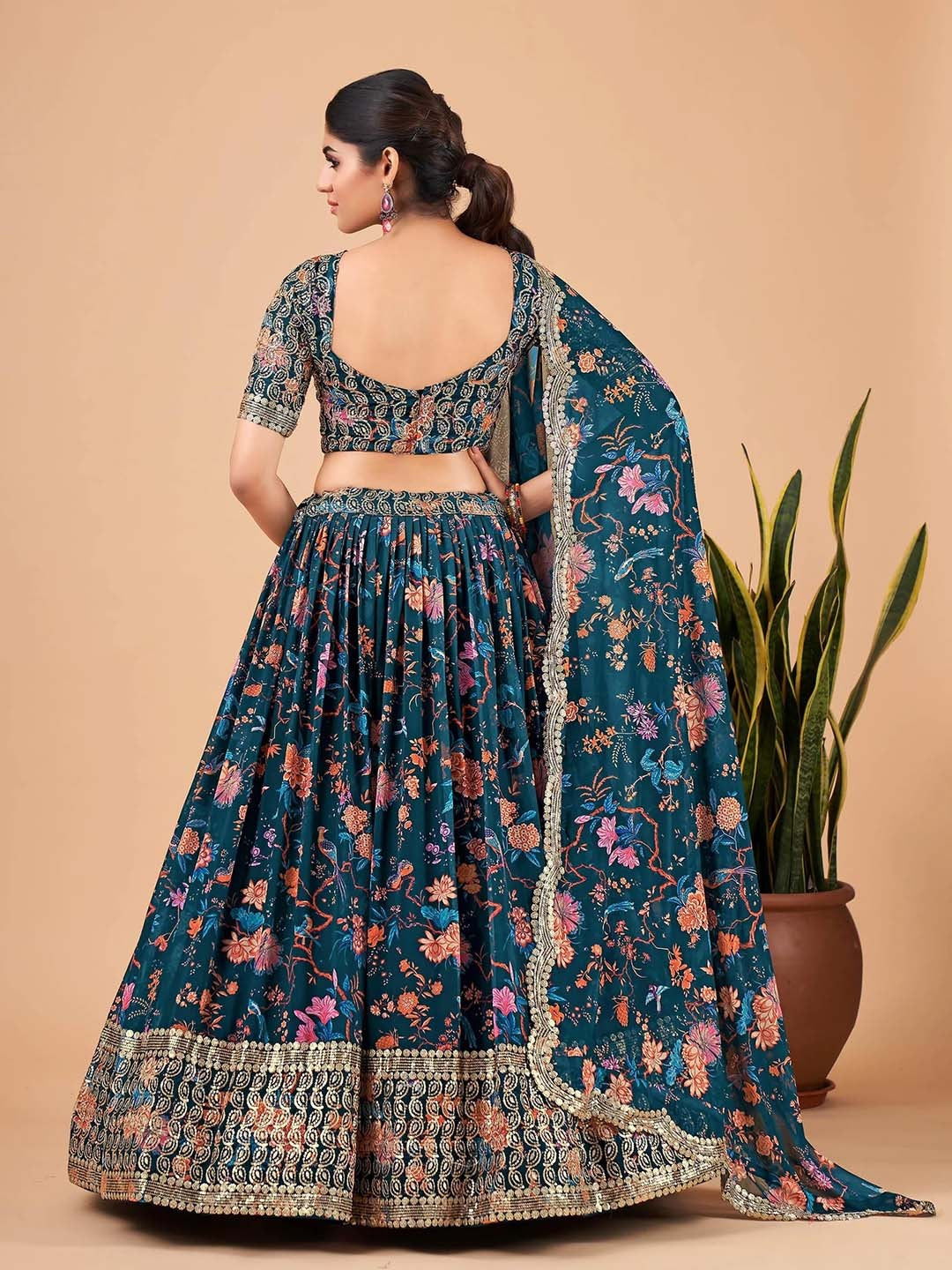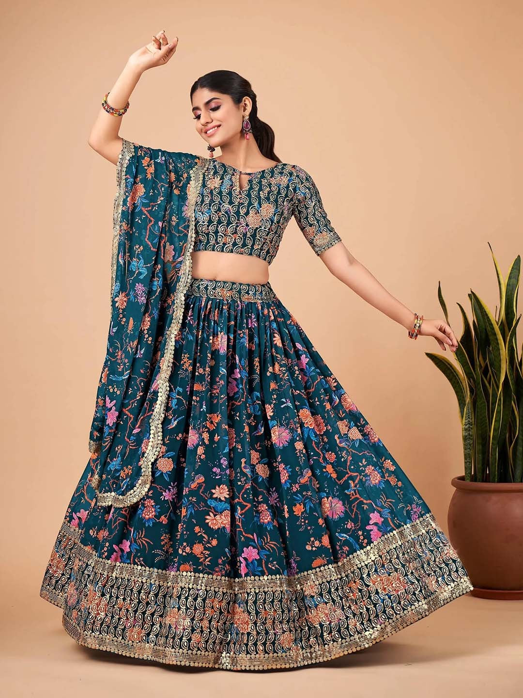 Navy blue and pink printed semi-stitched lehenga, flared hem