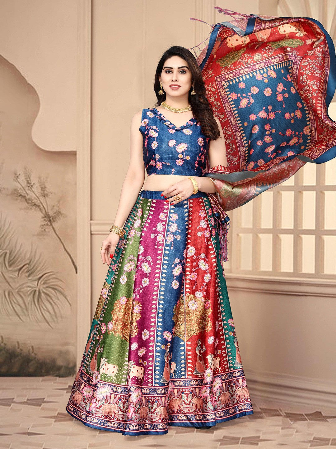 Blue and red printed unstitched blouse, has a v-neck, sleeveless, tie up closure