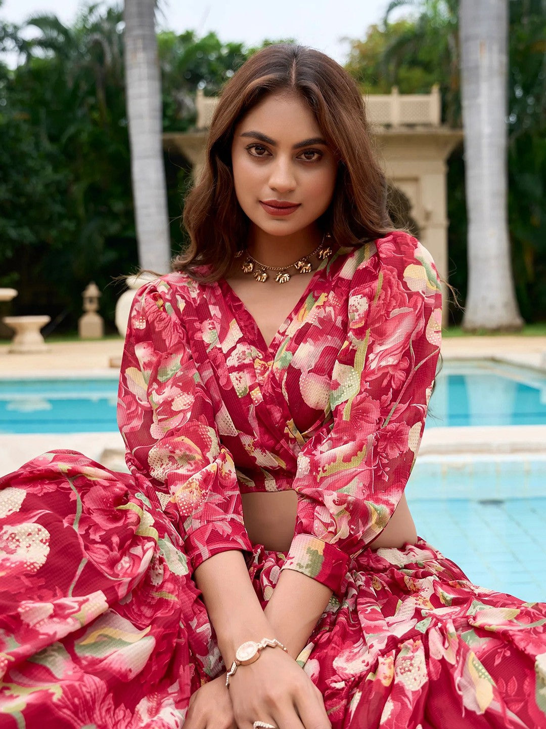 Red and green printed unstitched blouse, has a v-neck, three-quarter sleeves, red and green printed semi-stitched lehenga, flared hem